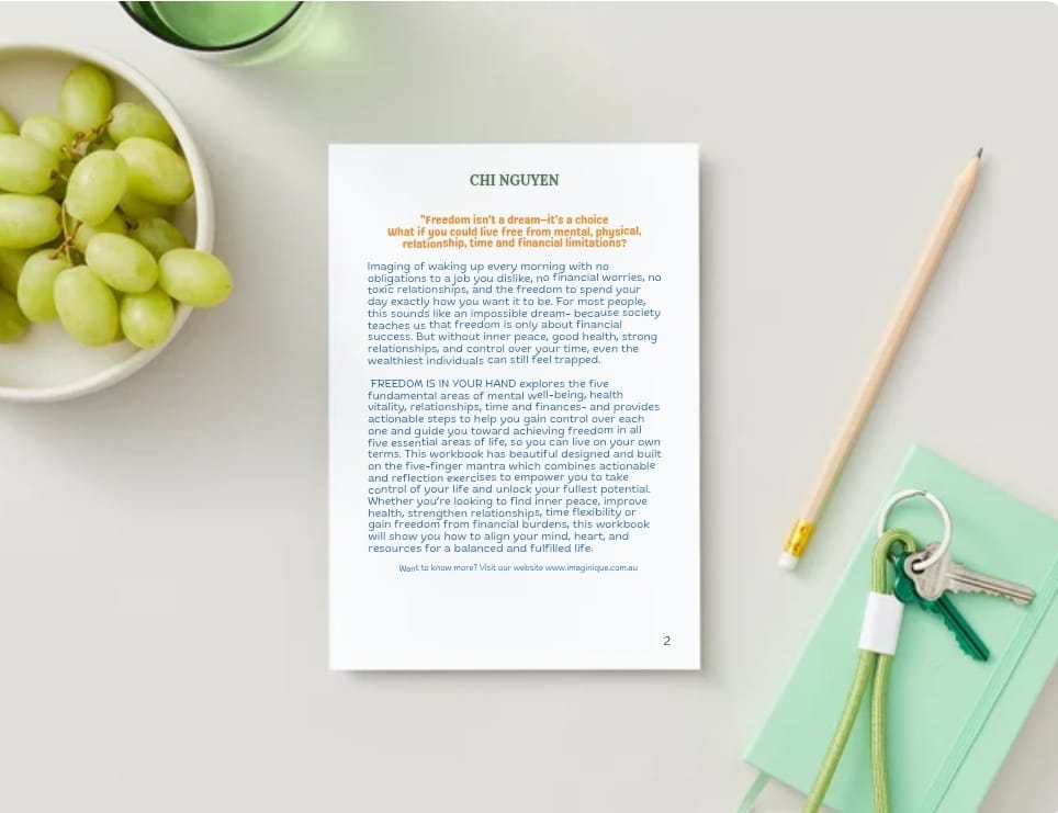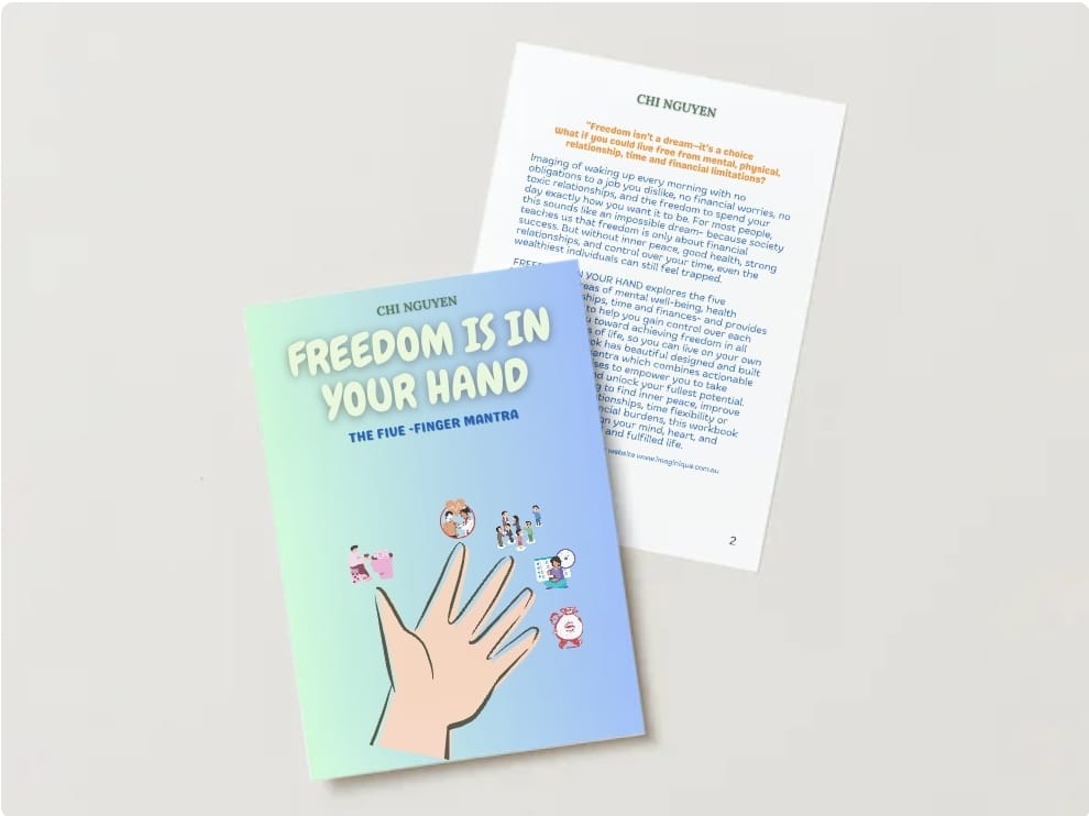 Freedom Is in Your Hand is a beautifully designed, 27-page guided workbook built on the Five Finger Mantra: Mental Well-being, Physical Vitality, Relationships, Time, and Finances.